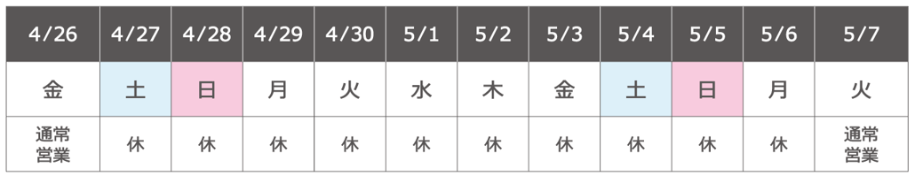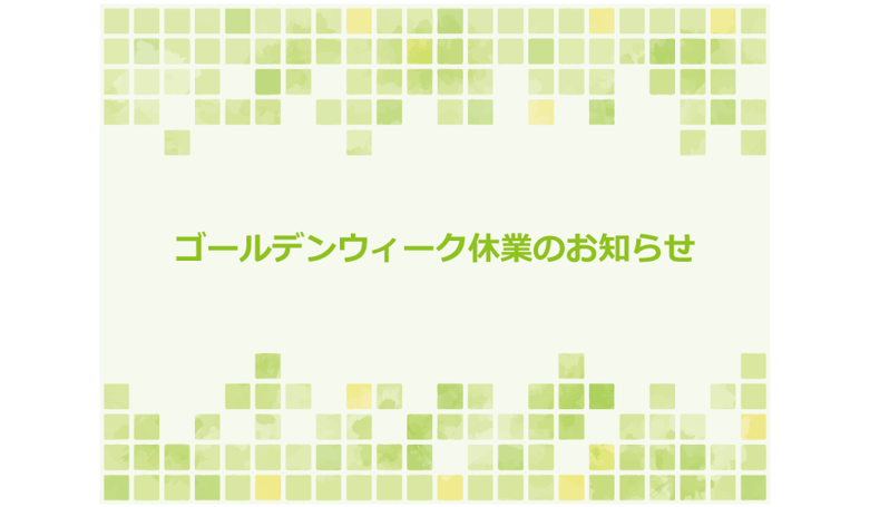 ゴールデンウィーク期間中、下記の通り休業いたします。